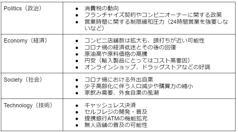 続いては、コンビニエンスストアの市場環境を例に、PEST分析を行いました。