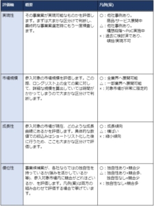 ロングリスト上の事業候補案の評価軸は各社によって何を重視するかによって異なりますが、下記がよく用いられる評価軸の例です。