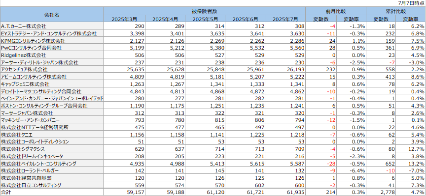 ひと言でいうと、2025年7月の被保険者数は前月比で-214名(-0.3%)の微減となり、春の採用シーズンのピークを越えて、人員最適化フェーズに入った兆しが見られます。全体としては3月から7月の累計で+2,350名(+4.0%)の純増となっており、業界は引き続き拡大基調にあります。