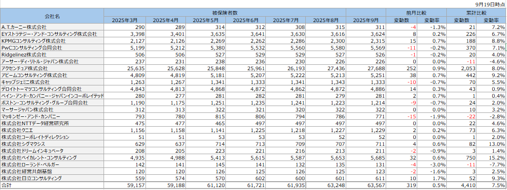 2025年3月から9月にかけて、主要コンサルティングファームの在籍者数(被保険者数)は堅調に拡大を続けています。特に8月は大幅増、9月は小幅な増加にとどまりました。本記事では、各月の特徴と増加要因を整理し、業界全体の人材戦略の動向を解説します。