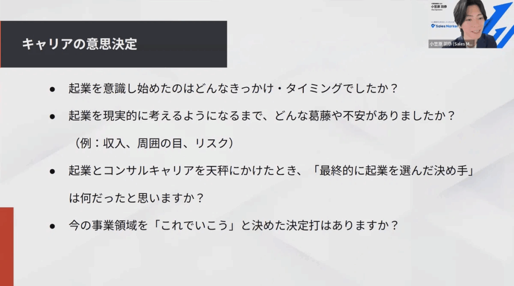 2025年4月21日(月)に、オンラインセミナー「元戦略コンサルが語る『なぜ今、起業なのか?』戦略思考x事業経験で挑むスタートアップ創業のリアル。」を開催しました。