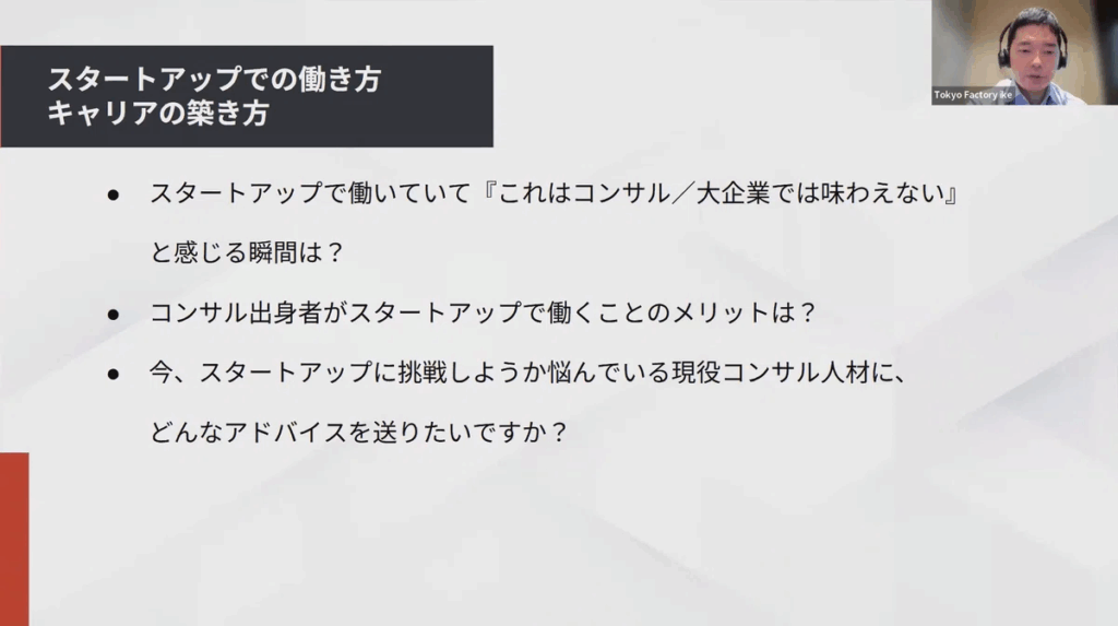 そして、「スタートアップで働くこと」について。大企業、コンサルファーム、スタートアップすべてを経験しているお二人だからこそ話せる貴重でリアルなエピソードをお話しいただきました。