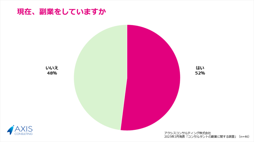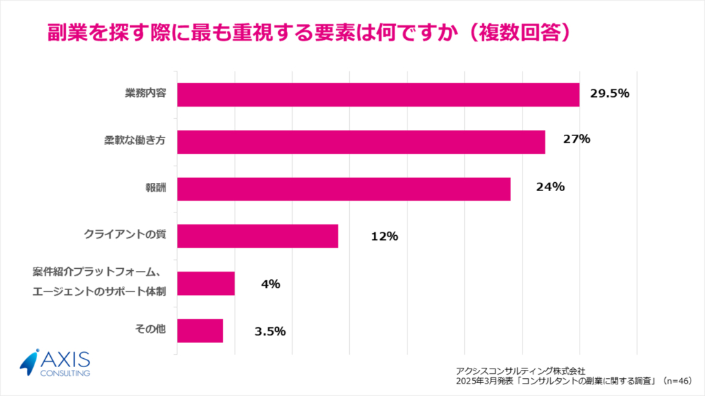 この結果から、多くのコンサルタントは副業を選ぶ際、単なる報酬額ではなく、「業務内容の魅力」や「本業とのバランスが取れる柔軟な働き方」を重視していることがわかります。