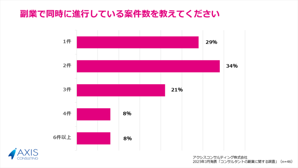 調査によると、副業を行った経験があるコンサルタントは52%に達しました。副業案件の同時受注数は1~3件が全体の84%を占めていますが、中には6件以上を同時に進行している方もいました。
