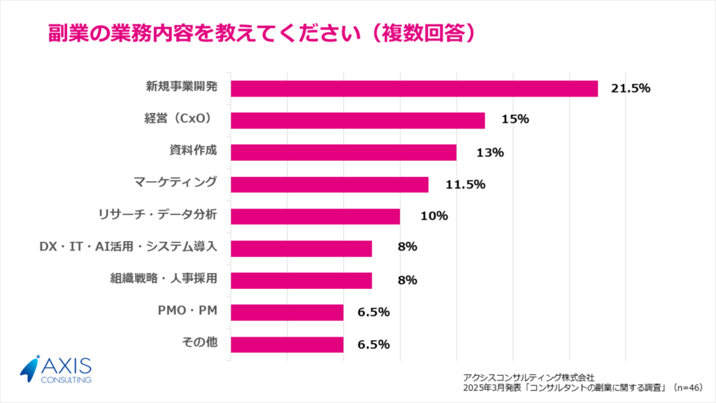 コンサルタントが副業として関心が高いのは、「戦略的・上流の業務」であることが明らかになりました。特に新規事業や経営層(CxO)に関わる仕事は、単なる作業代行ではなく、専門性を活かして企業の成長に直接貢献できる点が魅力として挙げられています。一方で、「資料作成」といった実務的な副業にも一定の需要があります。