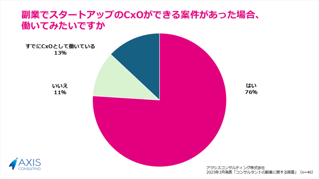 さらに、副業でスタートアップ企業のCxO経験を希望するコンサルタントは76%と非常に高く、自身のスキルや経験を、副業を通じてさらに磨きたいという意向がうかがえます。