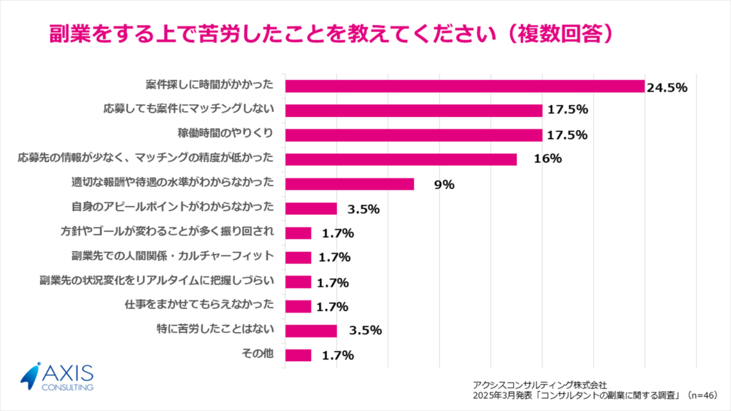 副業を経験したコンサルタントが挙げる課題として、「案件探しに時間がかかった」「応募しても案件にマッチングしない」「応募先の情報が少なく、マッチングの精度が低かった」などがあります。これらの課題を解消するため、副業マッチングプラットフォームでの透明性の高い情報提供や、より精度の高いマッチングシステムの構築が求められています。