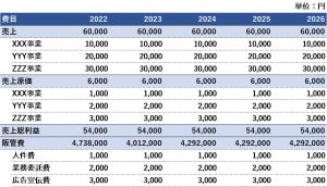 示したいポイントをセル色/文字色/文字の太さなどを変えて目立たせることで、相手の視線を誘導することができます。今回の例は事業計画ですので年別の売上・売上原価・売上総利益・販管費の合計を示すことが大切です。そのため、それらが目立つ工夫をしています。