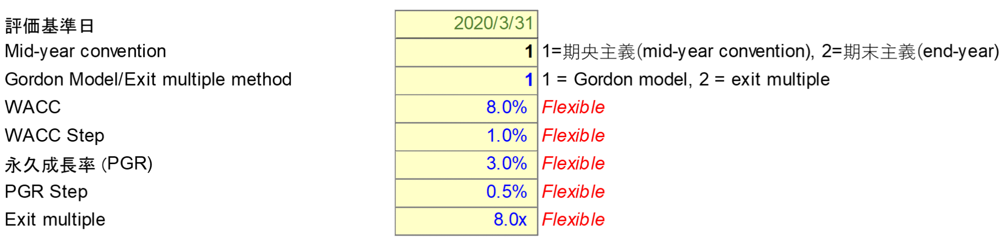 まずは、モデル上重要な仮定(バリュエーション基準日等)を以下のように設定します。