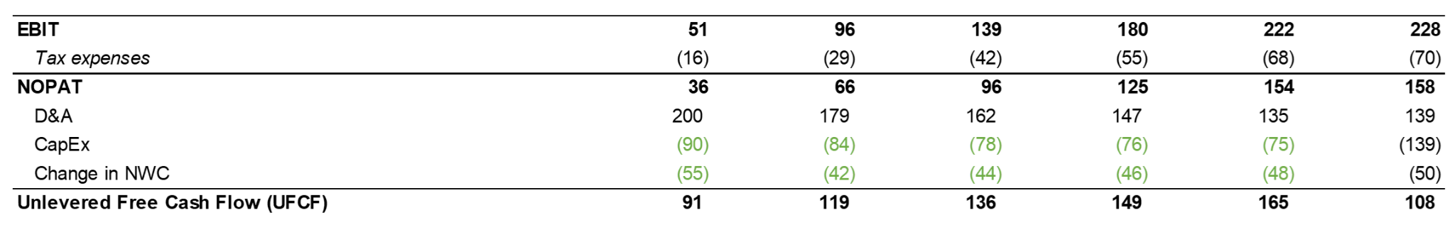 アンレバードフリーキャッシュフロー=NOPAT+DA―運転資本変動額―Capexという計算式に当てはめて計算出来たら、それを事業計画期間にわたり計算します。イメージは以下の通りになります。
