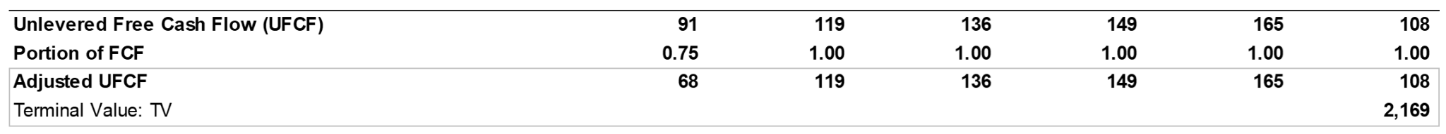 その後、バリュエーション基準日から計画期間初年度までは1年間フルのキャッシュフローではなくYeafrac関数を用いてPortion of FCFを計算します。下記のようなイメージになります。
