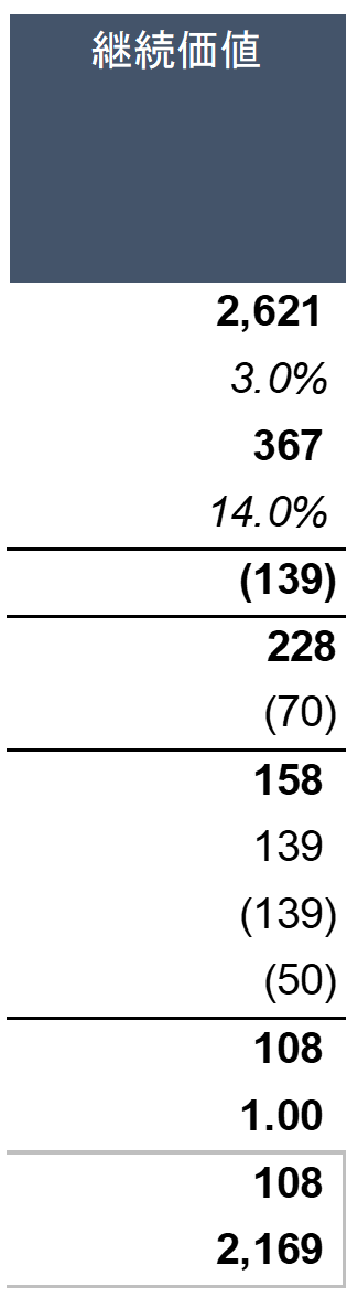 アンレバードフリーキャッシュフローの現在価値と、継続価値の現在価値が計算できればその合計値が事業価値(EV)になりますので、その数値からネットデット(もしくはネットキャッシュ)を加減することで株式価値を計算できます。
