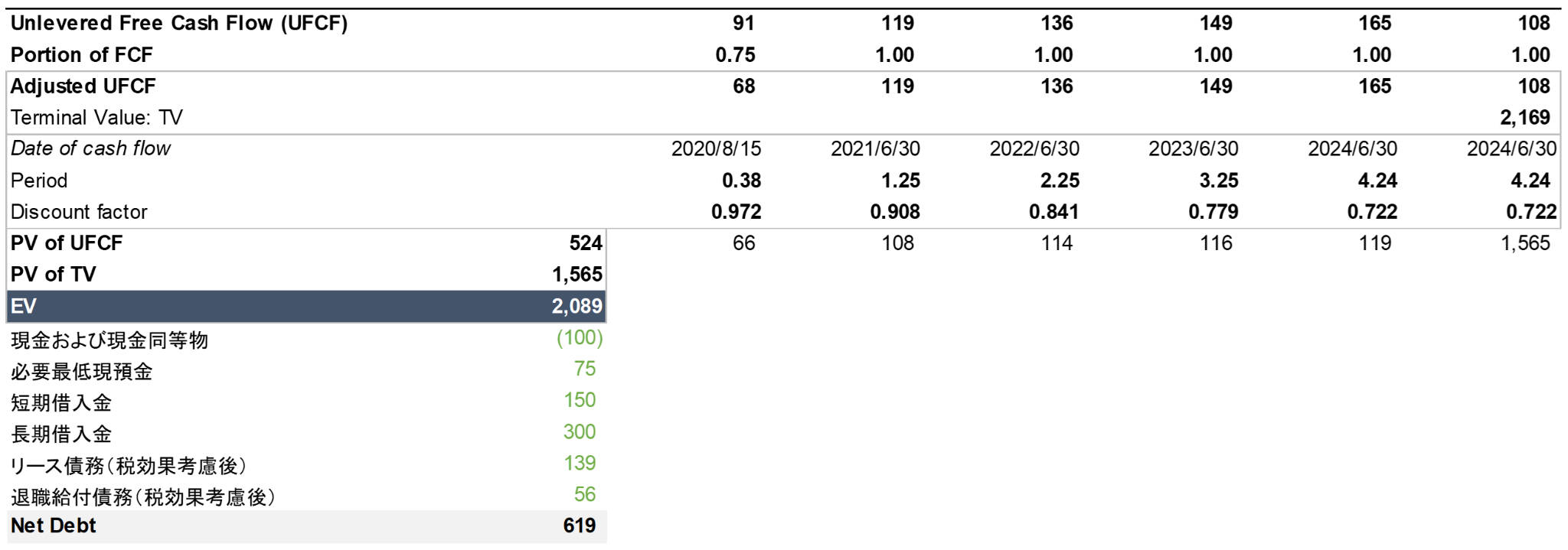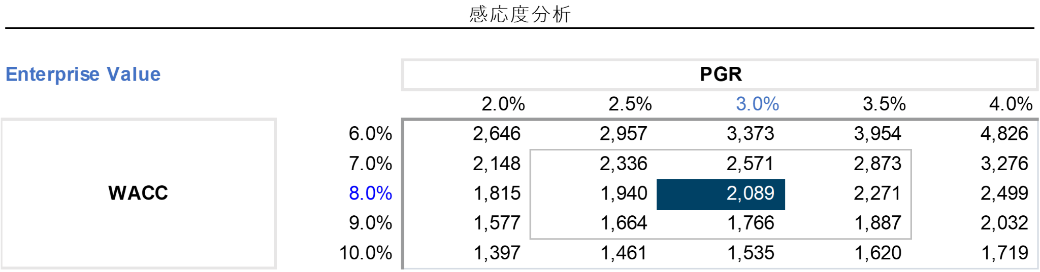 なお、EVを計算したらLTMの売上高・EBIT・EBITDAやFY+1の売上高・EBIT・EBITDAに対する倍率を計算し、同時にWACCと永久成長率(PGR)を使用して感応度分析を実施し、レンジを試算することができれば、DCFによる分析は完了です。