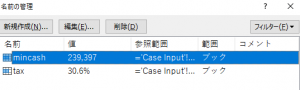 ここでは財務三表モデル上で使用するもののみを残します。下記はインプットシートで税率をtax, 必要最低現金をmincashとしてセルに名前を付けており、そこのみ残しています。