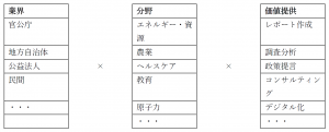 シンクタンクでは以下のとおり、官公庁をはじめとした様々な業界において、エネルギーやヘルスケアなど多様な分野をターゲットとして仕事を行っています。そして、各業界・分野を舞台にレポーティングや調査分析、政策提言、コンサルティング、デジタル化など様々な価値を提供しています。